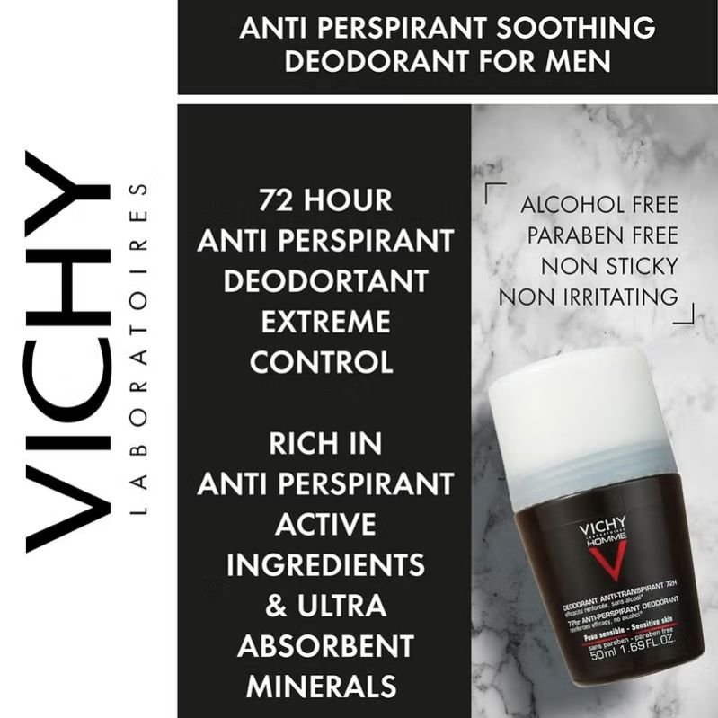 Vichy Homme Deodorant Anti-Perspirant 72 Hour, a formula rich in anti-perspirant active ingredients and ultra-absorbent minerals, regulates perspiration and moisture for 72 hours. Optimal tolerance, non-irritating and non-sensitizing Vichy Homme antiperspirant is formulated for people who want very long-lasting deodorant and anti-perspiration efficacy in all situations. Vichy Volcanic Water is the star active ingredient in Vichy skincare products. It is at the heart of the preserved region of Auvergne volcanoes in France that springs Vichy water. After a millennial path down to a depth of 4,000 meters, Vichy water charges itself with 15 minerals and mineral nutrients essential to skin s beauty. Vichy believes that health is vital. And that it starts with the skin. Vichy s heart is connected to people, to their lives, and to their skin. Vichy empowers all women and men, of all ages and phototypes, to have a positive impact on their skin and scalp health at every stage of their lives. Discover Vichy s full range of products & treatments online. Care for Your Skin with clinically tested and dermatologically recommended Vichy Products.