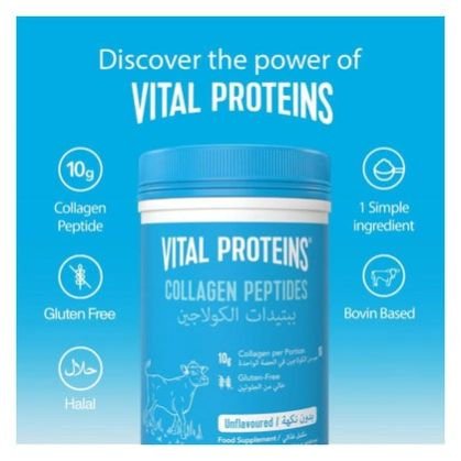 Vital Proteins Collagen Peptides were developed to help your body feel and look its best! The powdered food supplement is made from grass-fed, pasture-raised bovine hides and is certified halal to ensure a natural, superior, and sustainable supply of this ancient nutritional powerhouse. Made with only one ingredient, hydrolyzed collagen, these Collagen Peptides are easily and quickly digested and absorbed by the body. The collagen powder ensures cohesion, elasticity, and regeneration of your skin, hair, nails, tendons, cartilage, bones, and joints. All you need to take full advantage of this product is one scoop a day mixed with water or your favorite hot or cold drink or dish, be it coffee, tea, or a smoothie. Designed for your well-being, this unflavored and unscented Vital Proteins Collagen Peptides is Paleo certified, Whole 30 approved, and made without any added sugars, sweeteners, gluten, or dairy. The canister includes a scoop for measurement. Every scoop (one serving) contains 10 g of collagen peptides.