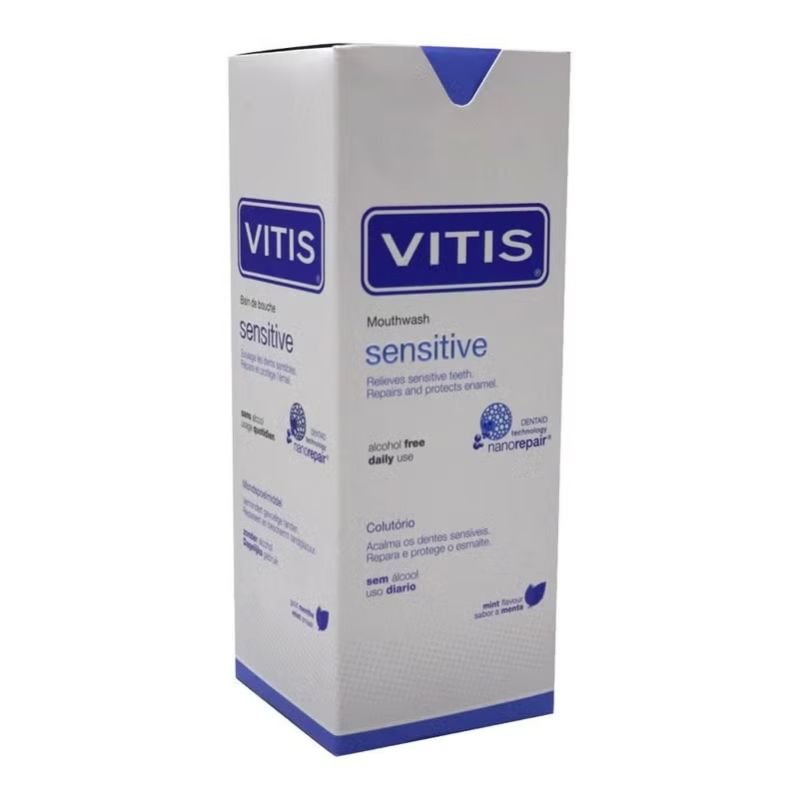 Vitis Sensitive Mouthwash has a special formula for sensitive teeth as it contains Hydroxyapatite Nanoparticles that seals dentinal tubules and repair the dentin surface, Potassium nitrate that inhibits the transmission of signals that cause discomfort, Sodium monofluorophosphate that remineralises enamel and prevents tooth decay, Provitamin B5 and Allantoin that protect gingival tissue.